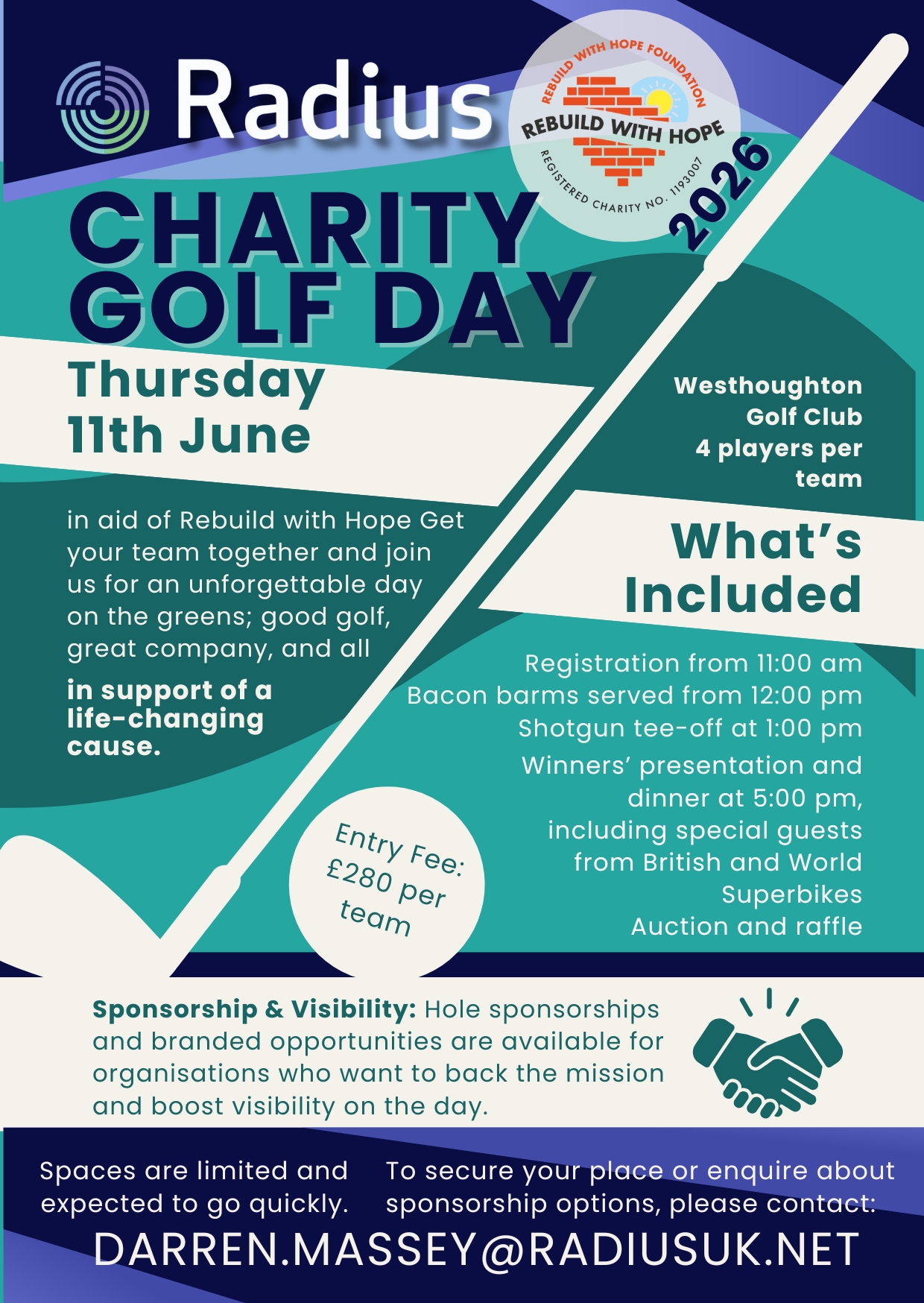 Charity Golf Day in aid of Rebuild with Hope. Join us for an unforgettable day on the greens; good golf, great company, and all in support of a life-changing cause.